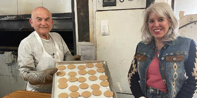 Behind the scenes at my favourite bakery, Golden Crown Panaderia, in my home town, Albuquerque, New Mexico. Founded in 1972, I have enjoyed trips to the bakery for most of my life and a photo op with owner Pratt Morales was a treat at the father-son run bakery. The panaderia is famous for biscochitos, the official cookie of New Mexico. These delicate anise seed shortbreads are available year-round but are especially in abundance at Christmastime. Other specialties at include green chile bread, empanadas, and award-winning pizzas.